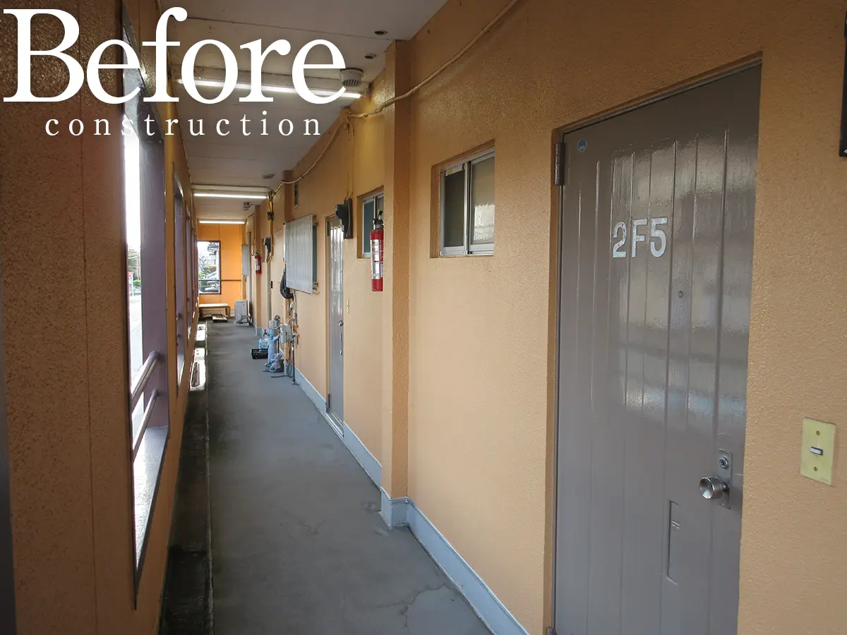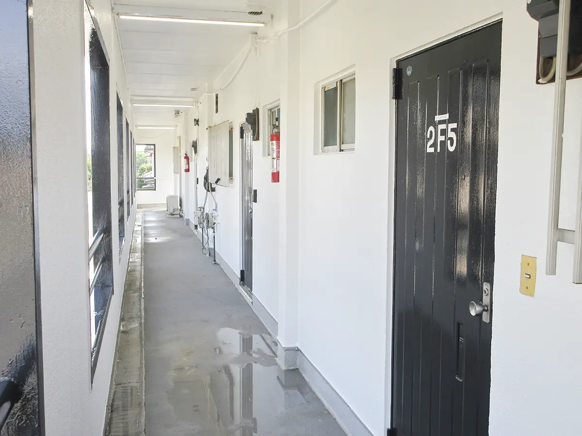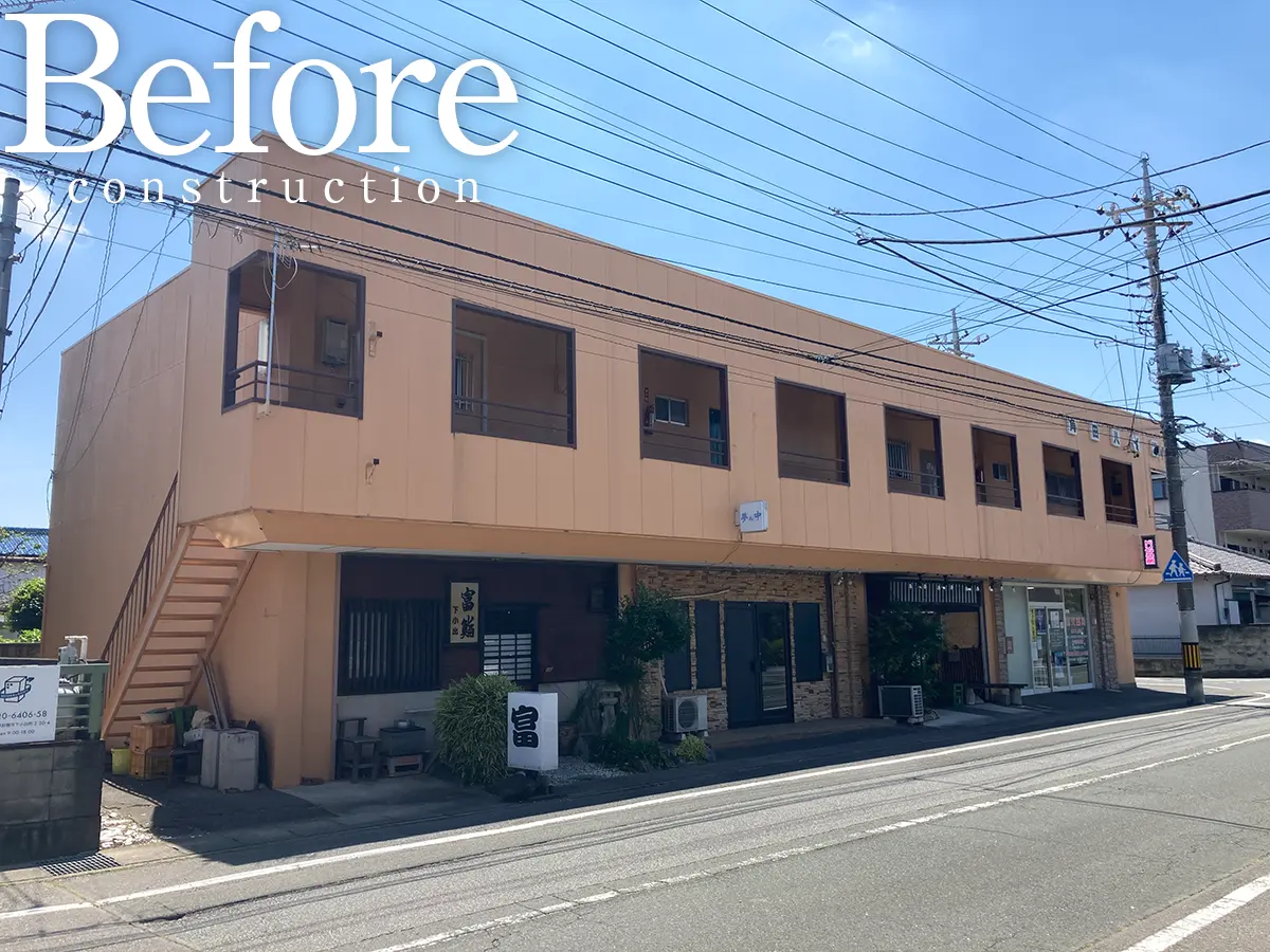 1977年築の建物の壁面は薄いオレンジ色。どことなく昭和な雰囲気を醸し出す建物を、全面黒く引き締まった建物へと生まれ変わりました。ワンポイントで赤い色をリズミカルに配置しました。